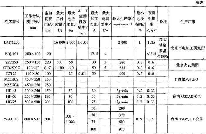电火花穿孔、成型加工机床可按大小分为小型(D7215型以下)、中型(D7125~D7163)以及大型(D7163型以上);也可按精度等级分为标准精度型和高精度型;还可按工具电极自动调节系统的类型分为液压进给型、步进电机或直流伺服电机进给驱动型. 电火花成型加工机床主要型号与技术参数见表3-5. 表3-5 电火花成型加工机床主要型号与技术参数