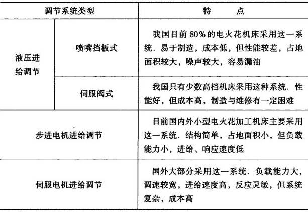 (4)工具进给调节系统 电火花加工时必须使工具和工件之间始终保持某一较小的放电间隙.间隙过大,所加电压不能击穿间隙,形成开路,无法实现电火花加工;间隙过校形成短路,也不能进行电火花加工.因此,工具电极自动进给调节装置和系统是电火花加工机床的重要组成部分.工具电极自动进给调节系统的类型与比较见表3-6. 表3-6 工具电极自动进给调节系统的类型与比较