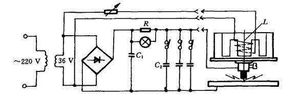 电火花强化及刻字的基本原理是基于工具电极振动,在空气介质中与工件表面进行电火花放电,使工具(电极)上熔化的材料扩散,覆盖在工件表面上,从而改变工件表面力学性能,达到表面强化和刻字的目的.