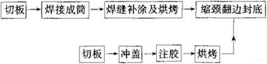 图3-3-3 三片罐生产工艺流程 (1)切板 是将整张印涂好的薄板切成规定尺寸的罐身片,一般采用“纵横剪床”来完成。纵横剪将由传送带送来的一张张薄板,通过几对圆型滚刀切成规定宽度(例如罐身片长度)的几条后,继续前进1~2m,然后按序逐个落入另一套横行传输系统,经迅速定位后,第二套指定宽度(罐身片的高度)的滚刀将长条切成了罐身片。这些裁片由人工汇集后放入焊机堆片口。 罐身片的切片误差每边都必须在0~100μm以内,切口的毛边高度应小于25μm,切斜误差应小于片长的±0.06%。 现代切板机均能24h连续运转,并保持切板误差不增加。 (2)焊接成筒 是靠电阻焊机来完成的,焊机是制罐线的心脏设备,其工作步骤如下: