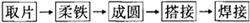图3-3-4 罐身板柔铁成圆原理 ②搭接定位:依靠Z形导轨两侧凹槽的逐渐靠近,此导轨正对焊轮的出口端,其叠接宽度正好是设计值0.30~0.50mm。显然,Z形导轨的前端必须用极为耐磨的硬质合金钢制造。 ③焊接:搭置好的罐身筒要进一步在两个加压的电极间等速直线平动,电极就必须是可转动的滚轮。滚轮用高硬度、高导电率的铜合金制造。为了保持其转运部分与固定的轮轴部分最佳的导电状态,轮中密封有高导电率的汞(有毒,已渐淘汰)或特殊的糊状有机良导体等,这样才能在几千安电流通过时不引起显着的损耗。再者,为了带走焊点高温导致的滚轮发热,轮内都有冷却水循环。 在焊接中如果使焊轮与镀锡薄板表面直接接触,那么熔融的锡将沾在焊轮上,愈积愈多,污染各处。为此,在焊轮上嵌入扁平铜线,以黏附并带走焊缝上的锡,如图3-3-5所示。在这样的盘绕路线之下,扁铜线的两面会从上、下两焊轮带走筒体焊缝两面的熔锡。