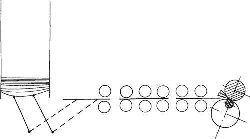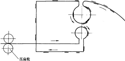 ①取片至成圆:用真空泵带动两个吸盘,从片垛的下面(少量设备是从上面)吸取一张罐身片后,平动至几对钢辊间被滚压以消除应力,然后再经尖劈弯折和一对半径不同的滚筒辗压后,平板就变成了有一定曲率的圆筒,再由推杆或链上齿爪推入搭置定位导轨,即Z形导轨的开端。罐身柔铁成圆原理见图3-3-4。