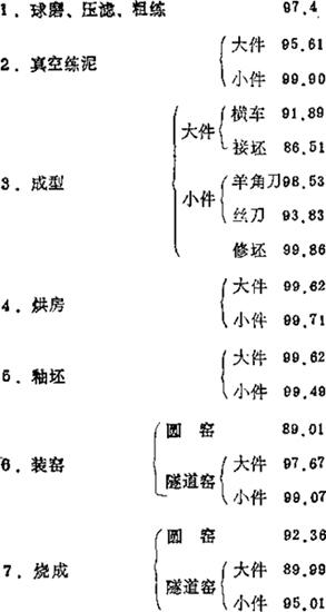 | 字词 | 电瓷各工序加工损失率及回浆率(回坯率)实例(1985年收集) |