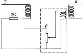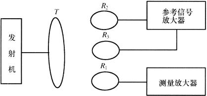 图11-4 振幅比-相位差法观测原理示意图 11.2.2.2 电磁偶极剖面法 电磁偶极剖面法的特点是:①装置轻便,使用灵活,工作效率高;②可选择与地质体较强耦合关系的发射形式,从而提高探测能力;③勘探深度较浅。一次场的分布形态与均匀各向同性介质中电偶极子的电场基本相同,二次磁场随线圈中心到观测点的距离的立方衰减,场的方向是一次场分量的方向角的函数。用磁偶极子场工作时应注意场的方向性,并采用适当的装置使强的一次磁场穿过目标体,以增强二次磁场异常。电磁偶极剖面法包括有:虚分量-振幅法、水平线圈法、倾角法。 (1)虚分量-振幅法 本法测量磁场振幅及虚分量。取接收点最强的那个分量作为参考讯号,观测与参考讯号呈正交方向的磁场虚分量。可不用参考电缆,测量原理见图11-5。图中发射线圈T铅直放置,参考线圈R2与T共面,而接收线圈R1与T正交,接收磁场垂直分量,R3为补偿线圈,输出磁场补偿信号。要测垂直分量的虚部,本应以一次磁场讯号为准,测量与其成90°相位分量。此法所测量的虚分量是与水平方向总场成90°相位的那个分量,因这种参数讯号的相位与一次磁场不一致,故测得的虚分量与理论值有误差。但是在有利条件下,以测点处最强的磁场分量为参数讯号,所测得的虚分量与理论值之差较小。
