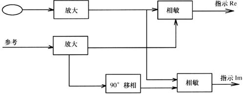 图11-2 实、虚分量法补偿式线路原理图 当实、虚分量都观测时,用相敏检波器直接检测,其原理见图11-3。待测信号U测由放大器输至两个独立的相敏检波器,由相敏检波原理可知,输出信号U输出正比于输入信号U测中与基准电压同向的分量,显然只输出实分量;基准电压与参考信号相位差90°,它只输出U测的虚分量。