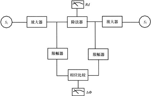 图11-3 实、虚分量法直接检测原理示意图 实、虚分量法的主要特点是:异常幅度大,曲线形态简单,仅观测振幅时工作效率较高。 (2)振幅比-相位差法 该方法可观测剖面上相邻两点磁场振幅的比值及两点磁场间的相位差。工作中通常保持两接收线圈水平,即观测磁场垂直分量的振幅比及相位差,其场源可采用不接地大回线或接地的无限长导线。 振幅比-相位差测量仪器多采用直接读出振幅比(Rd)和相位差(△Φ)的直读式方案(图11-4)。接收线圈S1、S2将所在点的磁场转换为感应电动势后,经各自放大器一方面加到除法器上进行振幅的除法运算,输出至指示器指出振幅比(Rd);另一方面通过限幅器将讯号限幅,送至相位比较器。其输出电压代表了两个讯号的相位差(△Φ),并在另一指示器给出。