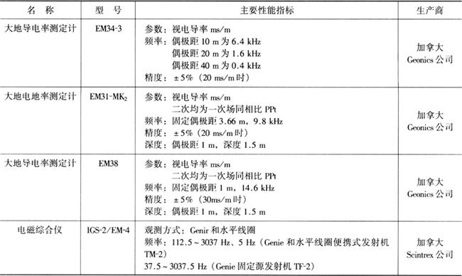 图11-5 虚分量-振幅法测量原理图 此方法的优点是便于发现异常,容易提高观测精度和勘探深度;地形影响小;多频虚分量观测结果有较好的评价和区分异常能力。缺点是对仪器稳定性要求高,工作不方便;缺失实分量信息,特别对良导体及磁性体需比虚分量大得多的实分量信息。 (2)水平线圈法 该方法是电磁法中较常用的一种。它采用轻便的发射线圈和接收线圈,参考信号是发射线圈旁的一个固定线圈上的感应电压,通过连接在发射与接收线圈的传输电缆供给补偿器,选用2~3个400~4000Hz之间的工作频率用一次磁场归一化的方法测量实、虚分量。 该方法的特点是:异常形态简单,收发距、覆盖层、地形对异常影响比较大,尤其是实部影响虚部的异常形态,勘探深度30~50m。因为观测ReH/H和ImH/H属于相对测量,它具有相对测量的优缺点。 (3)倾角法 倾角法是测量椭圆极化长轴与一次磁场间空间夹角的一种电磁剖面法。常用的方法有:定源垂直线框倾角法(VEM)、平行移动倾角法(BEM)、对消倾角法(LEM)。 定源垂直线框倾角法:该法是将发射线框垂直放于目的体在地表投影点上,距其数十米布设垂直于目的物走向的测线,接收机沿测线观测。每次观测首先要求发射线框面与接收线圈面相互照准,故在发射线框处根据观测点所在位置预先计算好线框架水平度盘应取得方位角,然后依顺序转动水平度盘。接收线圈的照准方法是,将线圈面垂直放置并沿垂直轴转动,找到接收器指示最大读数的线圈方位,然后照准该方向进行倾角测量。由于发-收线圈面处于照准状态,在测点上一次场只有水平分量,地下目的体在一次场的激励下产生二次场有似偶极场的性质。在各测点上,二次场方向是由通过该点之磁力线的切线求得,其幅值决定于测点到等效发射中心的距离。 平行移动倾角法:平行移动倾角法又称旁线倾角法。发射线圈和接收线圈分别放在相距100m左右的不同测线同号测点上。测定一个测点后,发-收线圈同时移到下一测点。发、收线圈要相互照准。 (4)对消倾角法 该方法的野外观测方法是:两个操作员用预先选定的发、收距在同一测线上进行同线观测。工作时,首先是甲操作员发射,乙操作员接收;然后倒换,由乙操作员发射,甲操作员接收。测量倾角时,观测操作员面向着使发射操作员在自己的左侧的方向,并照准垂直测线的方向观测倾角,记录点取两者的中点,绘图的倾角值取两者之和。对消倾角法在消除地形造成的倾角异常方面有良好的效果。在野外工作中不要求发、收线圈间相互对照。其异常范围宽,可适合山区等地工作。缺点是异常范围宽且形态复杂,当地质噪声大和不稳定时,不易辨认有意义的异常。 11.2.3 成果表达形式 (1)水平距离(或点号)随各种参数变化的坐标曲线,横坐标代表距离(或点号),纵坐标代表振幅、虚分量、相位、倾角等各种参数; (2)各种参数的平面剖面图,主要用于面积性勘查工作; (3)各种参数的等值线剖面图。 11.2.4 资料解释原则 实、虚分量法对野外实测结果进行推断解释时,首先应对定性解释给予应有的重视,如确定异常范围、走向长度、倾斜方向等。其方法大致上与直流电法相同。用不同频率测得的剖面曲线可定性地判定异常源导电性的优劣,如用几种频率测得的虚分量异常只随频率增高而增高,则其导电性较差;当异常值随频率增高而减少时,其导电性较好。对于干扰影响较少的光滑曲线可作定量解释。 振幅比-相位差法解释方法与实、虚分量法一样,也可以利用振幅比-相位差法做出异常复平面图,进而进行实、虚分量转换解释振幅比、相位差的资料。 在各种偶极电磁法中,发-收距的选择很重要。当极距很小时,由于接收点处一次磁场大,故相对于它的二次磁场百分异常小;随着发-收距增加,二次磁场相对增加,故百分异常增大;收-发距太大时,异常变得复杂,出现双负峰,且异常值变小,范围变宽。 11.2.5 仪器设备 电磁剖面法仪器设备见表11-2。 表11-2 电磁剖面仪一览表