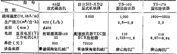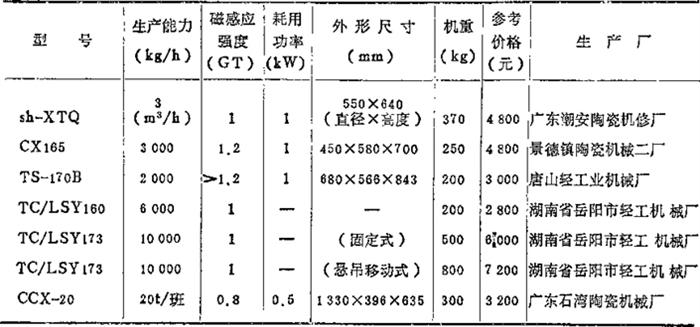 (表中为1978年价格) 2.湿式磁选机选型要点 (1)湿法除铁最好选用碗式(返回或通过式)除铁器。除铁效率低的槽式、棚式除铁器不宜选用。 (2)为提高除铁效率,一般采取联合机组串联使用,工作位置附近应考虑设置磁芯冲洗水池。 (3)景德镇电瓷电器公司批量生产湿法强磁(1-1.3T,仿日型)除铁器,较能适应南方陶瓷原料所含铁杂质的去除。 |