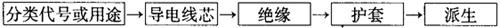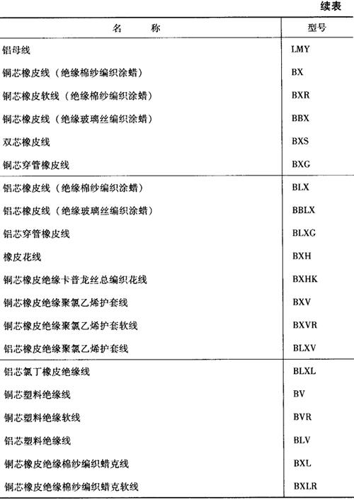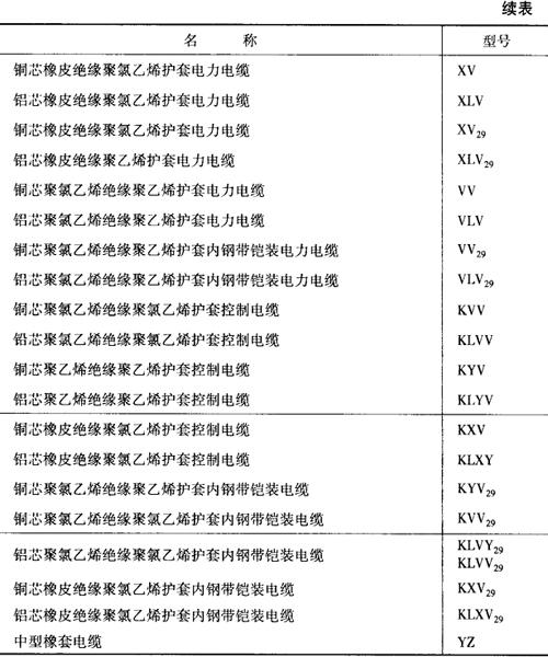 例如铝芯橡胶绝缘固定敷设电线的型号:BLXW。其中,B——固定敷设;L-铝芯;X-橡胶绝缘;F(省略)-氯丁橡胶护套;W-户外使用。 铜芯橡胶绝缘丁腈护套电机绕组引接电缆(电线)的型号:JXN。其中J-电机引接线;T(省略)-铜芯;X-橡胶绝缘;N-丁腈橡胶护套。 铜芯聚氯乙烯绝缘软线的型号:RVS-300/300V。其中R-连接用软线;T(省略)-铜芯;V-聚氯乙烯绝缘;S-双芯绞合型。额定电压为300/300V。 铝芯纸绝缘电缆的型号:ZLQ。其中Z-纸绝缘;L-铝芯;Q-铅包护套。 由于电线电缆品种多,产品结构及材料组成差异大,因此产品型号和代号说明较为复杂,可参见相应各类产品标准以及有关文献资料。以下对一些常用代号作简单说明: (1)有关产品名称:B-固定敷设电线电缆;N-农用直埋线;R-软线;Y-橡套软电缆;H-电焊机电缆;K-控制电缆;A-安装线;YT(T)-电梯电缆;D-带状电缆;J-电机引接线;Q-汽车低压线;QG汽车高压点火线;DC-铁路机车车辆电缆;C-船用电缆;F-航空电线电缆;W-承荷探测电缆;WQ-潜油泵电力电缆;WQJ-潜油泵引接电缆;U-矿用电缆;UC-采煤机电缆;UY-矿用移动橡胶软电缆;UZ-矿用电钻电缆;UM-矿工帽灯线;X-X射线机电缆;GZ-直流高压电子设备电缆。 (2)有关特性或用途:W-适用户外;R-软或较软;H-适用寒带;Y-有白蚊地区;Q-轻型;Z-中型;C-重型;F-不延燃烧性;C-彩色;Z-阻尼;J-加强型。 (3)有关材料和结构特征:T-铜芯或铜套;L-铝芯;V-聚氯乙烯绝缘或护套;Y-聚乙烯绝缘或护套;X-天然丁苯橡胶绝缘或护套;F-氯丁橡胶护套;E-乙丙橡胶绝缘;H-氯磺化聚乙烯绝缘或护套。N-丁腈橡胶护套;M-氯醚橡胶护套;G-硅橡胶绝缘;Z-聚酯薄膜或纤维绝缘(即纸绝缘);F46-聚全氟乙丙烯绝缘;YJ(J)-交联聚乙烯绝缘;B-聚丙烯绝缘;Y-聚酰亚胺/聚全氟乙丙烯薄膜绝缘;F-可溶性聚四氟乙烯绝缘;B-平行或扁型;S-双绞;H-扩套;P1-金属编织屏蔽(包括非金属);PT-金属屏蔽;P1-铜线缠绕屏蔽;P2-铜带绕包屏蔽;80-铜线编织;82-铜丝编织外挤聚氯乙烯护套。 (4)铠装结构:多用数字表达,22-钢带铠装;32-细钢丝铠装;10-油泵电缆钢带联锁铠装;20-油泵电缆钢带联锁铠装外挤聚氯乙烯护套;90-钢丝编织;92-钢丝编织外挤聚氯乙烯护套。 常用的电线、电缆的名称型号列于表12-1。 表12-1 常用电线、电缆的名称、型号