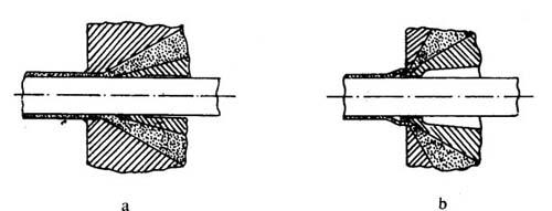 式中 d——导线直径(cm) D——包覆层外径(cm) p—-使用塑料的密度(g/cm3) S——牵引速度(cm/min) Q——挤出量(g/min) (3)螺杆 通常用的都是等距不等深的渐变型螺杆。挤出电缆时,为了提高产量也有采用分离型螺杆的。有关螺杆详见本章第一节。 2.机头 (1)机头形式。 机头的形式按塑料包覆时的情况分有内包式和外包式两种,见图4-7-7(a、b)所示。