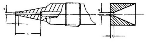 图4-7-8 内包式机头示意图 a-模芯孔径 L-模芯函长度 c-模芯工作长 D-模套孔径 1-模套工作面长度 ①模芯孔径与线芯的关系,见表4-7-8所示。 表4-7-8 模芯孔径与线径关系(mm)