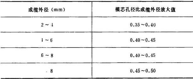 ③模套工作面长度l=绝缘外径D,有时为校正偏心也可采用l<D的尺寸。如绝缘层厚度缩小,l值也相应缩小。 外包机头 外包机头用于PVE、QVVR型圆形多芯成缆的挤护套,它的模芯孔径、模套孔径、模芯承线长度、模套工作面和模芯工作面的成型设计见表4-7-10。 表4-7-10 成缆外径与模芯外径的关系 (mm)
