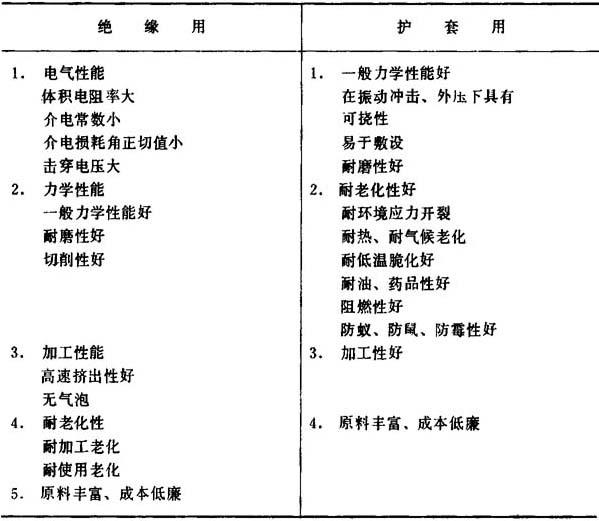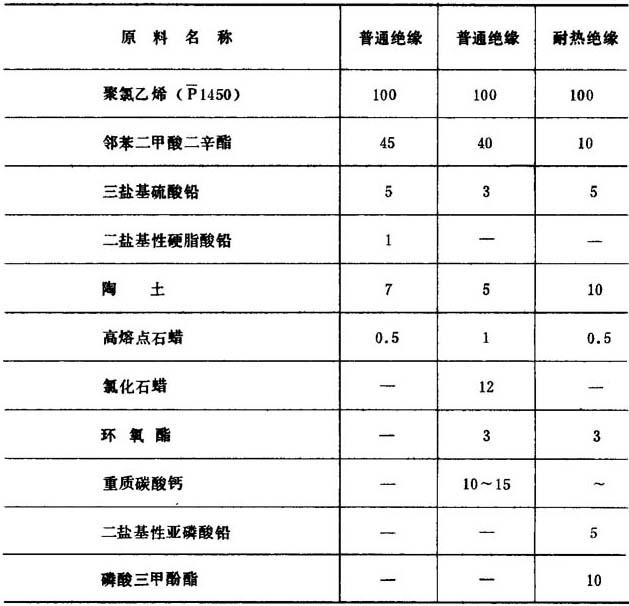 式中 D——模套孔径(mm) d——模芯孔径(mm) δ——护套层单面标准厚度(mm) 0.6——为模芯管两边壁厚2×0.3mm 模芯承线长度 L=60mm 模套工作面 l=22mm 模芯工作面 C=28mm (二)配方及工艺条件 1.配方 (1)原材料选择 聚氯乙烯电缆料按其用途的不同,可分为绝缘级及护层级两种。所用的塑料必须满足表4-7-11中的性能要求。 表4-7-11 电缆料的性能