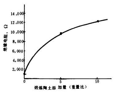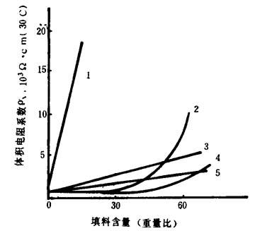 为满足以上各要求,在配方设计时,树脂应采用悬浮聚合的聚氯乙烯树脂。至于选用的增塑剂应除主增塑剂(通常都用邻苯二甲酸二辛酯)之外,尽可能多用石油磺酸苯酯,氯化石蜡等副增塑剂(详见第二章第二节有关电性能部分),这不仅因为后两者成本低廉,同时它们的电性能也优异,特别是受热后体积电阻率降低幅度比用苯二甲酸二辛酯小。含氯量为52%的氯化石蜡与聚氯乙烯的相容性也较好,甚至也可当主增塑剂用,但耐寒性较差,所以还须并用邻苯二甲酸二辛酯与癸二酸二辛酯等增塑剂以弥补它的不足。此外,两种增塑剂若与三盐基性硫酸铅、二盐基性亚磷酸铅、二盐基性硬脂酸铅、硬脂酸钙等并用,还可得到更好的效果。 (2)提高绝缘性的途径 如需进一步提高电线、电缆的绝缘性,在配方中还要添加填料与稳定剂。 ①填料的选择 一般填料仅能起到增量作用,但陶土和炭黑等却具有吸附离子的作用,从而能使体积电阻系数增大。不同种类的填料对体积电阻系数的影响不同,但填料越多体积电阻系数也越高。填料太多时会引起成品脆化,因此添加量需适当。填料与体积电阻系数与绝缘电阻关系见图4-7-9。