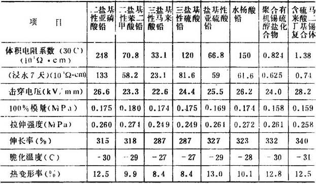 图4-7-10 添加煅烧陶土的软质聚氯乙烯绝缘电阻 配方: 聚氯乙烯 100 邻苯二甲酸二辛酯 60 三盐基性硫酸铅 10 煅烧陶土 0~10 ②稳定剂的选择 聚氯乙烯在老化分解中所生成的H+、C1-是使电性能降低的一个重要因素,为使其稳定,即不发生或少发生降解,需加入稳定剂。稳定剂的品种对电性能也有影响,表4-7-12列出铅和有机锡系稳定剂中某些品种对聚氯乙烯塑料电性能的影响。如所周知,有机锡系稳定剂具有透明性的特点,稳定效果也特别好。但从表中所列的数据来看,其电性能却不如铅系稳定剂。尽管铅系稳定剂的密度大、用量高,但它比较便宜,因此至今在电线和电缆的生产中所用的稳定剂仍然以它为主。 表4-7-12 各种稳定剂与电性能关系比较