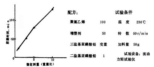 图4-7-12 胶凝时间随稳定剂量的变化 从图4-7-11及图4-7-12可知,稳定剂用量增加时,塑料的体积电阻也得到提高,但不如胶凝时间的增加。胶凝时间增加说明加工比较困难,所以稳定剂用量要适当。 铅系稳定剂中各个具体品种之间也有差别。例如:三盐基性硫酸铅耐热性良好,但耐候性稍差。二盐基性亚磷酸铅正与此相反,故通常都是并用。单用二盐基性亚磷酸铅时用量为5份以上,并用时为2份以上。在电线中氧化铅含量越多,稳定性也越高,因此在电缆中采用盐基性铅盐类及氧化铅等。从图4-7-13中可知盐基含量越高,体积电阻系数越高,原因是氧化铅能捕捉游离氯化氢和抑制离子的产生。