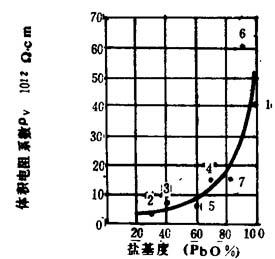 图4-7-13 盐基含量与电阻系数的关系(30℃) 1-氧化铅 2-盐基性碳酸铅 3-二盐基性硫酸铅 4-三盐基性硅酸铅 5-原硅酸铅与二氧化硅凝胶共沉淀物 6-二盐基性亚磷酸铅 7-二盐基性苯二甲酸铅 常用配方举例见表4-7-13。 表4-7-13 配方举例