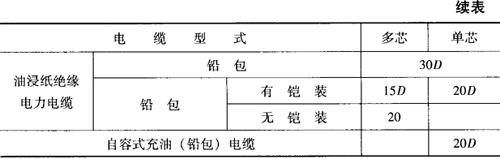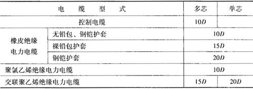 注:全塑型电力电缆水平敷设沿支架能把电缆固定时,支持点间的距离允许为800mm。 (6)电缆的最小弯曲半径应符合表12-70中的规定。 表12-70 电缆最小弯曲半径