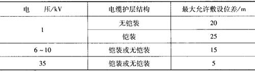 注:表中D为电缆外径。 (7)黏性油浸纸绝缘电缆最高点与最低点之间的最大位差,不应超过表12-71中的规定,当不能满足时,应采用适应于高位差的电缆。 表12-71 黏性油浸纸绝缘铅包电力电缆的最大允许敷设位差