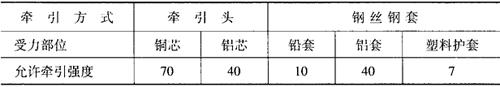 (8)电缆敷设时,电缆应从盘的上端引出,不应使电缆在支架上及地面摩擦拖拉,电缆上不得有铠装压扁、电缆绞拧、护层折裂等未消除的机械损伤。 (9)用机械敷设电缆时的最大牵引强度宜符合表12-72中的规定。充油电缆总拉力不应超过27kN。 表12-72 电缆最大牵引强度/MPa