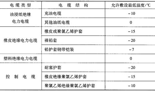 (10)机械敷设电缆的速度不宜超过15m/min,110kV及以上电缆或在较复杂的路径上敷设时,其速度应适当放慢。 (11)在复杂的条件下用机械敷设大截面电缆时,应进行施工组织设计,确定敷设方法、线盘架设位置、电缆牵引方向,并校核牵引力和侧压力,还应配备敷设人员和机具。 (12)机械敷设电缆时,应在牵引头或钢丝网套与牵引钢缆之间装设防捻器。 (13)110kV及以上电缆敷设时,转弯处的侧压力不应大于3kN/m。 (14)油浸纸绝缘电力电缆在切断后,应将端头立即铅封;塑料绝缘电缆应有可靠的防潮封端;充油电缆在切断后尚应符合下列要求: ①在任何情况下,充油电缆的任一段都应有压力油箱保持油压。 ②连接油管路时,应排除管内空气,并采用喷油连接。 ③充油电缆的切断处必须高于邻近两侧的电缆。 ④切断电缆时不应有金属屑及污物进入电缆。 (15)敷设电缆时,电缆允许敷设最低温度;在敷设前24h内的平均温度以及敷设现场的温度不应低于表12-73的规定;当温度低于规定值时,应采取措施。 表12-73 电缆允许敷设最低温度