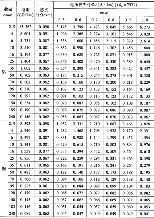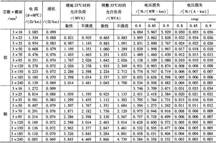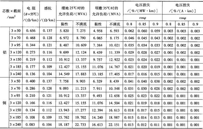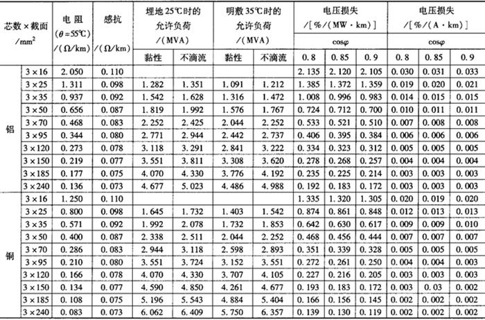 | 释义 | 电缆线路的单位电压降 35kV、10kV、6kV、1kV油浸纸绝缘电力电缆的电压损失列于表12-50~表12-54。 表12-50 35kV油浸纸绝缘电力电缆的电压损失
