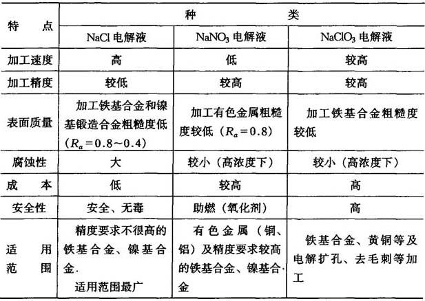 | 释义 | 电解液 电解加工,电解液正确选取十分重要,否则不会得到满意的结果. 7.3.5.1 电解液的作用 (1)作为工具(阴极)和工件(阳极),在外电场作用下进行电化学反应的介质,在阴极和阳极间传递电流,实现电解加工. (2)从工件与工具的间隙间排除电解产物,使工作正常进行. (3)冷却作用,带走加工中产生的热量. 7.3.5.2 对电解液的基本要求 (1)能确保电解加工高效可靠进行.这就要求电解液中电解质有很大的溶解度及离解度,且有高的电导率.溶液中的负离子能令阳极金属高速均匀溶解,尽量避免在阳极形成难溶性钝化膜,生产中常用含Cl-、 (2)能使被加工面有较高的加工精度及表面质量.这就要求电解液成分及性能稳定. (3)安全,无毒,腐蚀性小.为方便处理电解液,电解加工后的阳极产物应是不溶性化合物. (4)应用材料广泛,价格便宜. 7.3.5.3 电解液种类 电解液按溶剂分类可分为水溶液和非水溶液;按pH值分类可分为中性溶液、酸性溶液和碱性溶液;按组分分类可有单元电解液和多元电解液;按对阳极表面形成钝化膜的难易程度分类,可分为活性电解液和钝性电解液. 中性、酸性、碱性3类电解液的比较见表7-3. 表7-3 3类电解液比较
