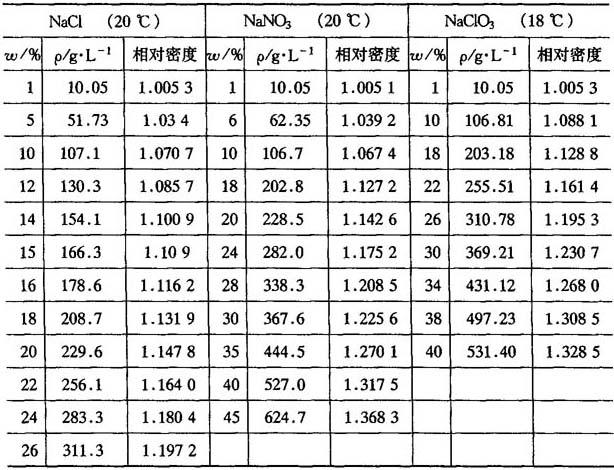 图7-7 NaCl温度、质量浓度、相对密度换算表