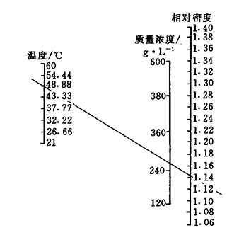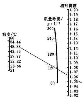 (2)相对密度、质量浓度、温度的关系 电解液的相对密度不仅与质量浓度有关,它还与温度有关.图7-6、图7-7、图7-8分别为3种常用电解液的相对密度、质量浓度、温度关系.只要知道其中两个数值,将其连线交于第三坐标,即可求得第三个数值.