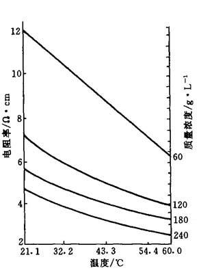 图7-8 NaClO3温度、质量浓度、相对密度换算表 (3)质量浓度、温度、电导率的关系 当电解液质量浓度和温度不同时,它所含离子数及在外电场作用下的运动速度亦不同,即其电导率也不同.图7-9、图7-10给出两种电解质溶液的电阻率、温度、质量浓度的关系曲线. 由图可以看出,当质量浓度或温度在不同范围内改变时,其电阻率的变化幅值也是不同的,其中质量浓度的影响最为明显.如以图7-10以例,当温度为21.1℃时,NaCl电解液质量浓度从60g/L增至120g/L,电阻率从12.0Ω·cm降到7.4Ω·cm,变化幅值为4.6Ω·cm,质量浓度平均每改变10g/L,则电阻率改变0.76Ω·cm.而当质量浓度从120g/L增至180g/L时,电阻率从7.4Ω·cm下降到5.5Ω·cm,变化幅值为1.9Ω·cm,质量浓度平均每改变10g/L,则电阻率仅改变0.31Ω·cm.而当质量浓度从120g/L增至240g/L时,电阻率改变值(质量浓度每改变10g/L)下降为仅0.14Ω·cm.由此可见,在低浓度时,由于质量浓度变化引起的电阻率变化比高质量浓度时引起的电阻率变化大许多倍.此结论对NaCl、NaNO3和NaClO33种电解液都是适合的.这表明:当电压一定时,若用低浓度电解液加工,对质量浓度控制应严格些;反之,在用高浓度电解液加工时,对质量浓度控制可以放松些.