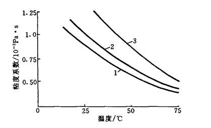 图7-11 电解温度与粘度关系曲线 1.水;2.ω=2%~3%的NaCl电解液;3.ω=12%的NaCl电解液