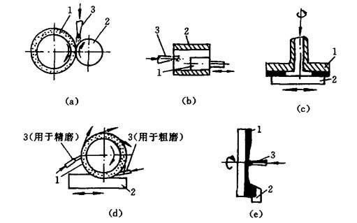 图7-30 各种电解磨削形式及电解液供给方式 (a)电解外圆磨;(b)电解内圆磨;(c)立式电解平面磨;(d)电解成型磨;(e)电解刀具磨. 1—导电磨轮;2—工件;3—电解液喷嘴 表7-19 各种电解磨削形式的电解液供给量