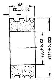 7.4.3.2 实例 图7-31为硬质合金轧辊简图,采用的导电磨轮为金属(铜粉)结合剂人造金刚石磨轮,磨料粒度为60~100目,磨削外圆的磨轮直径为Ф300mm,磨削型槽的成型磨轮直径为260mm.电解液用表7-17中第一种配方,其他工艺参数如下. 电压:2V(粗磨),10V(精磨); 电流密度:15~25A/cm2; 磨轮转速:2900r/min; 工件转速:0.025r/min(粗磨),16r/min(粗磨); 工作台移动速度:0.6mm/min. 加工后轧辊状况如下. 轧辊槽加工精度:±0.02mm; 型槽位置精度;±0.01mm; 表面粗糙度,Ra=0.2μm. 磨削后表面无微裂纹,无残余应力,加工效率高.采用金刚石砂轮,寿命长