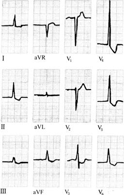 图135 血钾浓度与心电图变化的关系 (1)血钾正常;(2)、(3)、(4)血钾浓度递增 ·血钾>5.5mmol/L,心电图可表现为T波高耸,Q-T缩短; ·血钾>6.5mmol/L,心电图可表现为QRS增宽; ·血钾>7.0mmol/L,心电图可表现为P波振幅减小,时间延长; ·血钾>8.5mmol/L,心电图可表现为P波消失,可出现窦性停搏; ·血钾>10mmol/L,心电图可表现为缓慢的正弦波(QRS与T波融合),可出现室颤或室性停搏。 高大T波还可见于: ·变异性心绞痛; ·超急性期急性心梗; ·早期复极综合征等。 高血钾症的心电图变化如图136所示。