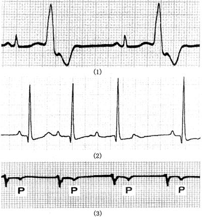 图143 洋地黄中毒时的心电图改变 (1)室早二联律;(2)Ⅱ度Ⅰ型房室阻滞;(3)交界性心律 ·胃肠道反应:食欲不振、恶心呕吐; ·神经系统表现:头痛、乏力、视力模糊、黄视、绿视等。 怀疑洋地黄中毒者,应急查血药浓度(正常为0.5~2.0mg/ml),但洋地黄的个体差异性很大,即使血药浓度正常,如有临床表现,也应考虑洋地黄中毒。 (2)治疗原则: ·停用洋地黄,快速性心律失常者可应用利多卡因或苯妥英钠; ·缓慢性心律失常者可使用阿托品; ·可使用地高辛抗体,血钾低时补钾。 6.奎尼丁或普鲁卡因酰胺(quinidine/procainamide) (1)奎尼丁或普鲁卡因酰胺过量使用时,可出现下列心电图表现(图144):