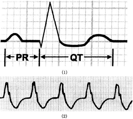图144 奎尼丁或普鲁卡因酰胺过量时的心电图表现 (1)Q-T间期延长;(2)室性自主心律 ·室早; ·室速(尖端扭转型); ·室颤; ·窦房阻滞; ·房室传导阻滞; ·室性自主心律或室性停搏。 (2)症状:临床上,病人可出现低血压、心衰和晕厥。另外,还可出现腹泻、恶心呕吐、耳鸣、听力障碍、白细胞和血小板减少等。心电图表现为:P-R间期>0.20s,Q-T间期延长,QRS波增宽。 |