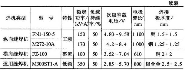表9-30 典型缝焊机主要技术参数