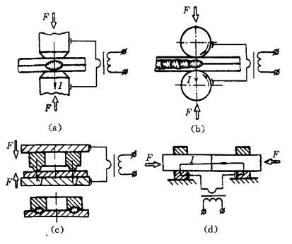 图9-10 主要电阻焊方法 (a)点焊;(b)缝焊;(c)凸焊;(d)对焊 3.凸焊 凸焊是指在一工件的贴合面上预先加工出一个或多个突起点,使其与另一工件表面相接触并通电加热,然后压塌,使这些接触点形成焊点的电阻焊方法. 凸焊主要用于焊接低碳钢和低合金钢的冲压件.凸焊的种类很多,除板件凸焊外,还有螺帽、螺钉类零件的凸焊、线材交叉焊、管子凸焊和板材T形凸焊等. 4.对焊 对接电阻焊(以下简称对焊)是利用电阻热将两工件沿整个端面同时焊接起来的一类电阻焊方法.对焊可分为电阻对焊和闪光对焊两种. 电阻对焊是将工件装配成对接接头,使其端面紧密接触,利用电阻热加热至塑性状态,然后迅速施加顶锻力完成焊接的方法. 闪光对焊是将工件装配成对接接头,接通电源,并使其端面逐渐移近达到局部接触,利用电阻热加热这些接触点(产生闪光),使端面金属熔化,直至端部在一定深度范围内达到预定温度时,迅速施加预锻力完成焊接的方法.闪光对焊又可分为连续闪光对焊和预热闪光对焊. 对焊生产率高,易于实现自动化,因而获得广泛应用.对焊可用于工件的接长、环形工件的对焊、部件的对焊以及异种金属的对焊. |