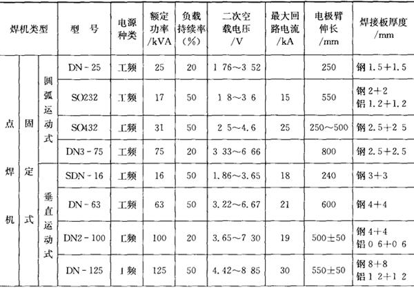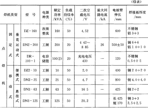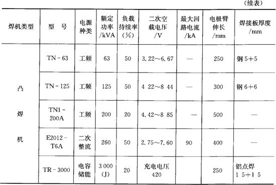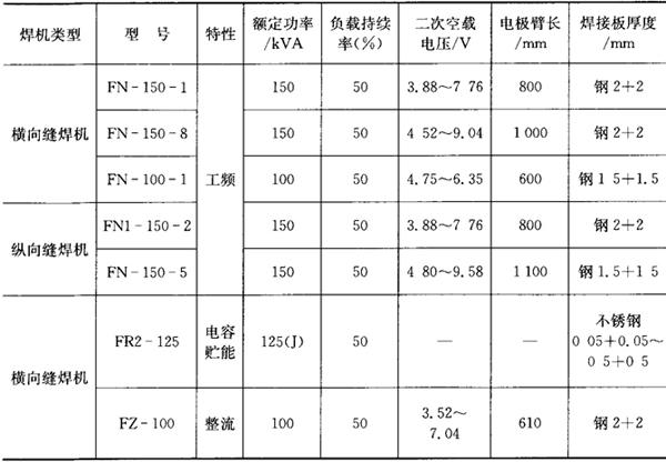 注:表中未特别注明的“钢”指低碳钢。 表4.6-2 缝焊机主要技术参数