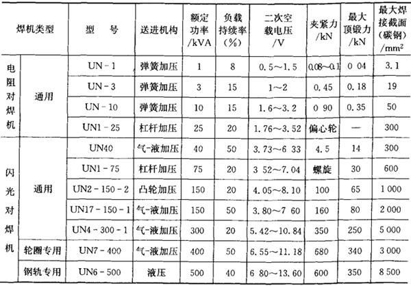 | 释义 | 电阻焊设备 电阻焊设备一般由机械装置(机身、加压机构、传动机构、夹紧和送进机构等),供电装置(电阻焊变压器、功率调节机构、主电力开关及焊接回路等)和控制装置三大部分组成。 表4.6-1为点焊机和凸焊机的主要技术参数。表4.6-2为缝焊机的主要技术参数。表4.6-3为对焊机的主要技术参数。 表4.6-1 点焊机和凸焊机的主要技术参数