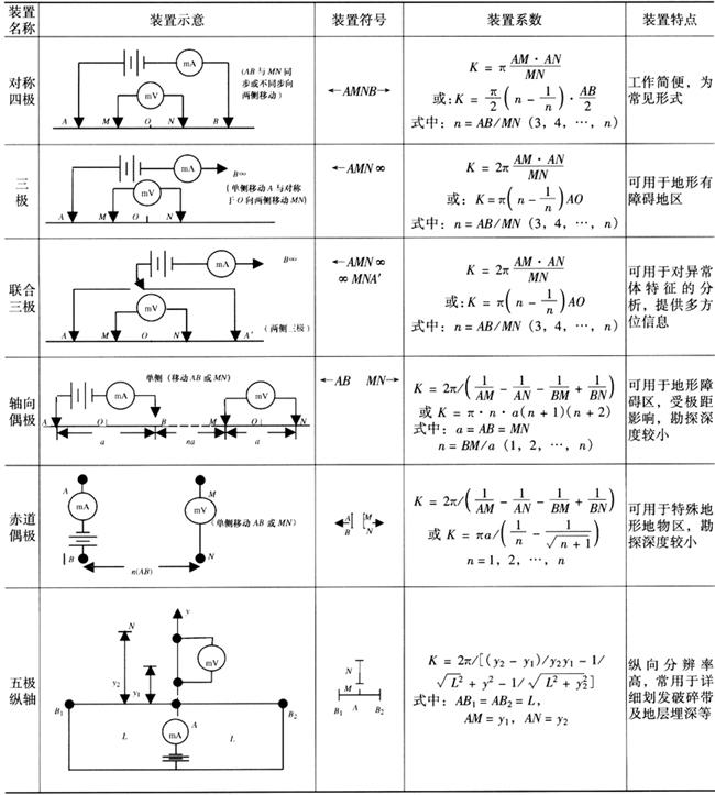 | 释义 | 电阻率测深法 10.4.1 电阻率测深法基本原理 电阻率测深法(简称电测深法)(Resistivity Sounding),以地下不同岩矿的电阻率差异为基础,建立人工电流场,并以不同的极距观测同一测点在不同深度处岩矿的视电阻率;通过研究地电断面,查明地质构造或者解决与深度有关的地质问题。电阻率测深视电阻率公式同(10.6)式。 10.4.2 观测方法 电测深法的装置形式见表10-5。 表10-5 常见电阻率测深装置及特征一览表