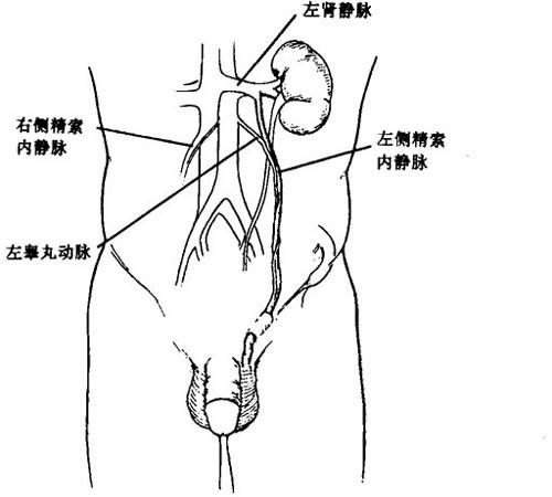 图16-1 引起精索静脉曲张的左肾静脉和左精索内静脉关系示意图 注:右精索静脉曲张少见,这是因为右精索内静脉直接注入腔静脉