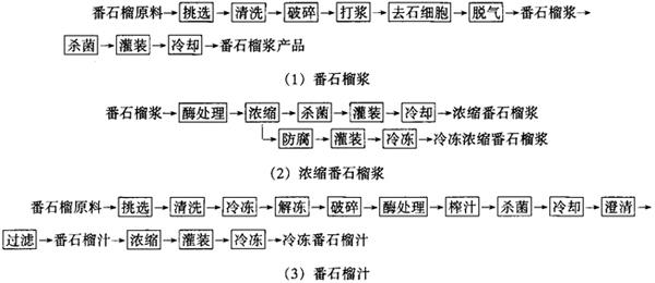 番石榴成熟时,果皮多为黄色或黄绿色,也有红色的。果肉根据体系,有白色、奶油色、黄色、桃红色和红色等颜色。番石榴属浆果,pH为3.3~3.5,成熟时,果肉变柔软,含有石细胞,有粗糙感。加工番石榴应选用果肉厚、种子少、石细胞少的原料。番石榴有特有的麝香芳香(Musky flavor),适合制成果肉型饮料。 (二)番石榴浆和汁生产技术 番石榴浆和汁生产工艺流程见图2-1-45。