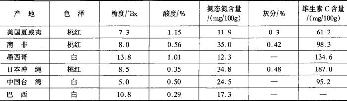 | 释义 | 番石榴浆与汁 (一)番石榴的营养成分与加工特性 番石榴果实成分中,最具特征的是维生素C的含量高,通常200~400mg/100g,最高可达1000mg/100g。而且还原型的维生素C为总维生素C量的70%~90%。维生素C平均含量相当于柑橘类的6倍以上,是维生素C的一种丰富来源。因此在欧洲番石榴汁较多用于婴幼儿食品的制造。日本伊藤对番石榴果皮、果肉和果芯部分的维生素C含量进行调查,结果表明果皮中的维生素C含量最高,而果芯部分的维生素C含量最少。 番石榴果实中的糖主要是蔗糖、葡萄糖、果糖、木糖和鼠李糖。游离氨基酸有γ-氨基丁酸、缬氨酸、丙氨酸、苏氨酸、天冬氨酸和谷氨酸,其中γ-氨基丁酸最多,为氨基酸总量的50%以上。番石榴中的有机酸有柠檬酸、苹果酸和乳酸等。番石榴果实中的成分见表2-1-67。 表2-1-67 番石榴果实的成分