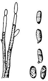 图2-15 番茄叶霉病病原菌 分生孢子梗和分生孢子 3.发病条件 高湿是病害发生的重要条件。病菌发育的适宜温度为20~25℃,大棚、温室内相对湿度高于90%以上易流行。大棚、温室遇连阴天、湿度大发病重。北京地区大棚春播及秋播番茄叶霉病均发生为害。春播温室番茄于4~5月,大棚番茄于5月下旬至6月间,秋棚番茄于9~10月间,如大棚通风不良,棚内湿度过大,番茄叶霉病发展迅速。春保护地温湿度适宜,从发病至盛发流行,一般7~15天。晴天阳光充足,棚内短期增温至30~36℃,对病菌有较大的抑制作用。 4.防治方法 (1)选用抗病品种 北京蔬菜研究中心选育的双抗2号,对叶霉病有较高的抗病性,适用于1号、2号生理小种地区,佳粉15号适于4、5号小种区,均兼抗病毒病,但不抗灰霉病、早疫病。辽粉3号、佳红及8966等均较抗病,各地选用时,应根据当地情况确定。 (2)加强放风排湿 摘去下部病叶、老叶,以利通风透光,增加光照,温度控制在28℃以下,相对湿度控制在75%以下,这是防治叶霉病的关键措施,如不配合农业措施,仅靠化学防治,很难奏效。 (3)药剂防治 选用的药剂有2%武夷菌素(BO-10)水剂150倍液、80%代森锌可湿性粉剂500倍液、50%多菌灵可湿性粉剂500倍液、70%代森锰锌可湿性粉剂500倍液、80%大生(喷克、丰收)可湿性粉剂600倍液、47%加瑞农可湿性粉剂500倍液、75%百菌清可湿性粉剂600倍液、50%甲基托布津可湿性粉剂600倍液、58%甲霜灵锰锌可湿性粉剂500倍液。每隔7~10天喷1次,连续防治2~3次;或40%福星乳油10000倍液,或6%乐必耕可湿性粉剂2000倍液,或25%敌力脱乳油3000倍液,每隔7天喷1次,连续防治3次,防效在96%以上。可用硫磺粉,每55立方米空间0.13千克,锯末0.25千克混合后,用煤球或木炭点燃,于定植前关闭棚室熏烟24小时,或用45%百菌清烟剂每公顷棚室3750克,或30%百菌清烟弹每公顷棚室4500克熏烟,或5%百菌清粉尘剂、5%加瑞农粉尘剂,每公顷棚室15千克喷粉(具体方法参看黄瓜霜霉病防治)。 |