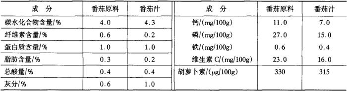 | 释义 | 番茄汁与酱 (-)番茄的营养成分与加工特性 番茄营养丰富,可溶性固形物含量4.0%~6.0%,其中65%为还原糖。番茄有机酸含量0.4%~0.6%,主要是柠檬酸和苹果酸。番茄色素是类胡萝卜素,主体是番茄红素(Lyoopcne),其次是β-和γ-胡萝卜素以及叶黄素类。在红色系的番茄中,番茄红素占全部类胡萝卜素的70%~80%。成熟番茄-般含有8~12mg/100g的番茄红素。番茄原料及番茄汁的营养成分见表2-1-74。黄色番茄汁与红色番茄汁成分比较见表2-1-75。 表2-1-74 番茄和番茄汁的主要营养成分