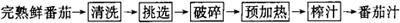 (二)番茄汁生产技术 1.番茄汁生产工艺流程 番茄汁有国际食品规格委员会果汁规格专家会议制定的国际规格。按定义,番茄汁是从成熟的红色或带红色的番茄中榨出的未经浓缩的汁液。在榨汁前可以不经热烫,也可热烫后打浆。番茄汁可以用各种方法加热,但不得加水。番茄汁已经滤去皮、子和粗硬纤维素,但含有细小而悬浮的番茄碎肉。 用浓缩番茄汁稀释还原的制品也称番茄汁。 番茄汁是由番茄原料经过破碎,榨汁而成的。以番茄汁或浓缩番茄酱为原料可以加工成100%果汁的番茄汁和加入蔬菜汁、香辛料的调味番茄汁,此外还有果汁含量50%的番茄汁饮料、番茄乳酸菌饮料等。番茄汁生产工艺流程见图2-1-48。