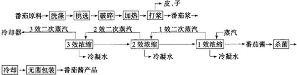 蒸发系统的蒸汽与物料的流向多采用逆流方式,以3效蒸发器为例,新鲜蒸汽从1效蒸发器进入,1效蒸发器产生的二次蒸汽向2效蒸发器流动,2效蒸发器的二次蒸汽向3效蒸发器流动。番茄浆则从3效(1段)蒸发器进入,经过2效(2段),番茄酱从1效(3段)蒸发器出料。 以750t/d番茄生产线为例,选用3效蒸发器,番茄浆(5°Bx)进料量30t/h,各效加热温度与相应真空度如下: