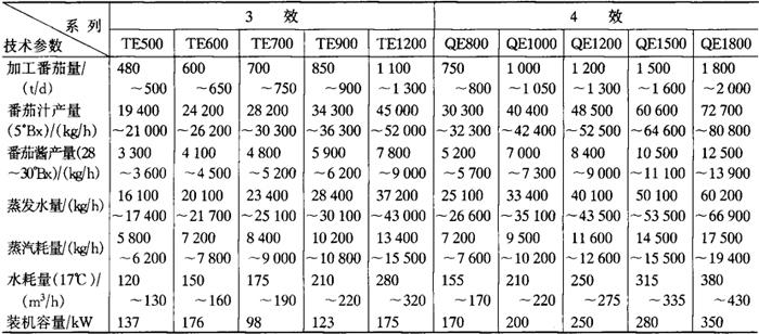 图2-1-49 番茄酱生产工艺流程 2.生产要点 番茄浆(汁)生产要点见番茄汁生产一节,番茄酱主要工序有浓缩、杀菌与冷却以及无菌包装等。 (1)浓缩 番茄浆是热敏性物质,容易受到高温损害,通常采用真空加热法浓缩。由于真空降低了汁液的沸点,因而可以在较低温度下蒸发。另一方面,番茄浆黏度高,宜采用多效升膜式强制循环式加热,可根据生产能力选择效数,目前常用3~4效,其规格性能见表2-1-76。 表2-1-76 番茄酱生产用3~4效蒸发器规格