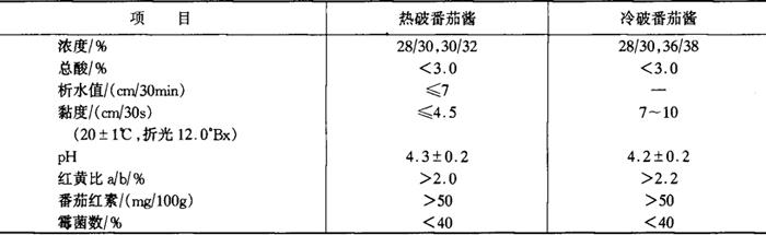 (2)杀菌与冷却 番茄酱pH4.3以下,由于番茄常附着土壤菌,因此杀菌条件比汁要求严,一般118~120℃,保持40~60s。 目前番茄酱无菌包装前的杀菌与冷却有两种方式: ①列管式杀菌冷却器:为间接式杀菌方式,管内为番茄酱流路,管外加热用蒸汽或热水,冷却用冷水。 ②喷射杀菌与闪蒸冷却:为直接式杀菌方式,番茄酱与蒸汽直接接触并混合,利用蒸汽的汽化潜热加热番茄酱。蒸汽喷射器(Steam injector)将蒸汽分几路喷射至管道中流动的番茄酱中,番茄酱的温度迅速被提高至104~105℃,在保温罐内保持30min后,在真空下瞬时蒸发,又从番茄酱中除去稍多于喷射蒸汽而带入的水分量,使番茄酱冷却至35℃左右,同时番茄酱浓度有所提高。 (3)无菌包装 除番茄酱罐头外,番茄酱均采用桶装袋(Bag in drum)形式无菌包装。 每一个包装在灌装前都要用蒸汽对灌装头灌装部位和袋口进行杀菌,并在充满蒸汽的无菌条件下将杀菌并冷却的番茄酱灌装至无菌袋中并进行密封。无菌袋容量一般为200L,有的1000L,外包装为钢桶或木箱。无菌包装机包装能力为60袋/h。 3.番茄酱产品质量指标 番茄酱产品质量主要指标见表2-1-77。 表2-1-77 番茄酱产品质量指标